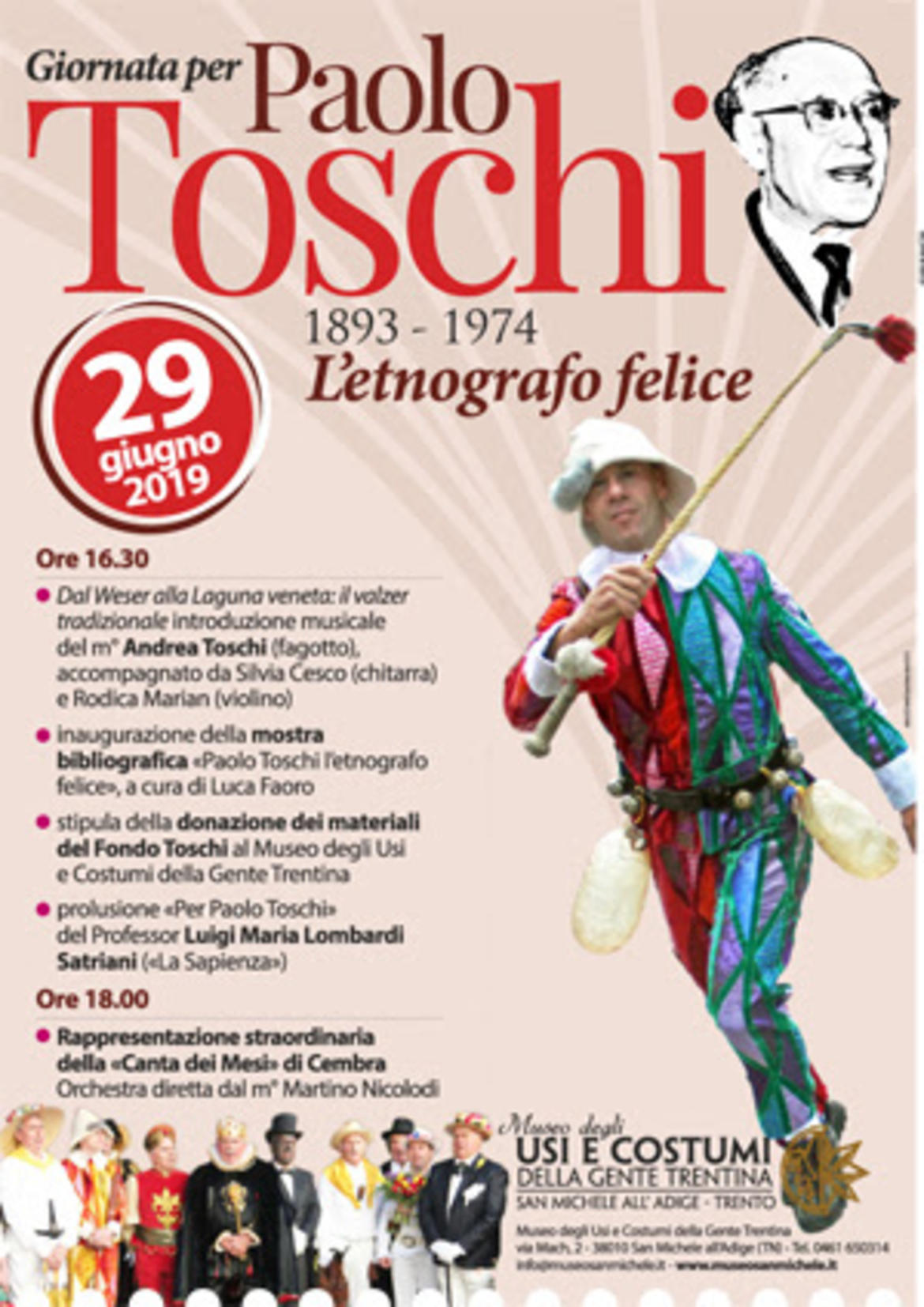 “Paolo Toschi. L’etnografo felice” è il titolo della mostra che sancisce la donazione del Fondo Toschi alla Biblioteca del Museo degli Usi e Costumi della Gente Trentina, per un gentile atto di liberalità dei nipoti dello studioso. Il Fondo comprende più di cento tra monografie, estratti e riviste, a cui si aggiungono atri numerosi documenti, come immagini, fotografie e dattiloscritti, che vanno ad arricchire il ricco patrimonio della Biblioteca Šebesta. Nella giornata di sabato 29 giugno questa importante donazione viene celebrata a partire dalle ore 16.30 conla musica del Maestro Andrea Toschi “Dal Weser alla Laguna veneta: il valzer tradizionale”, la prolusione del Professore emerito Luigi Maria Lombardi Satriani e la rappresentazione straordinaria della “Canta dei Mesi” di Cembra.