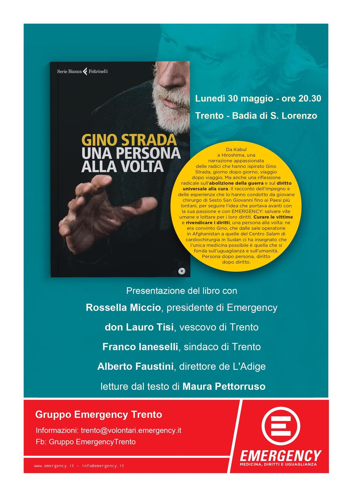 Il gruppo Emergency di Trento organizza nel capoluogo la presentazione dell'ultimo libro di Gino Strada, fondatore dell'associazione: Una persona alla volta, edito da Feltrinelli.