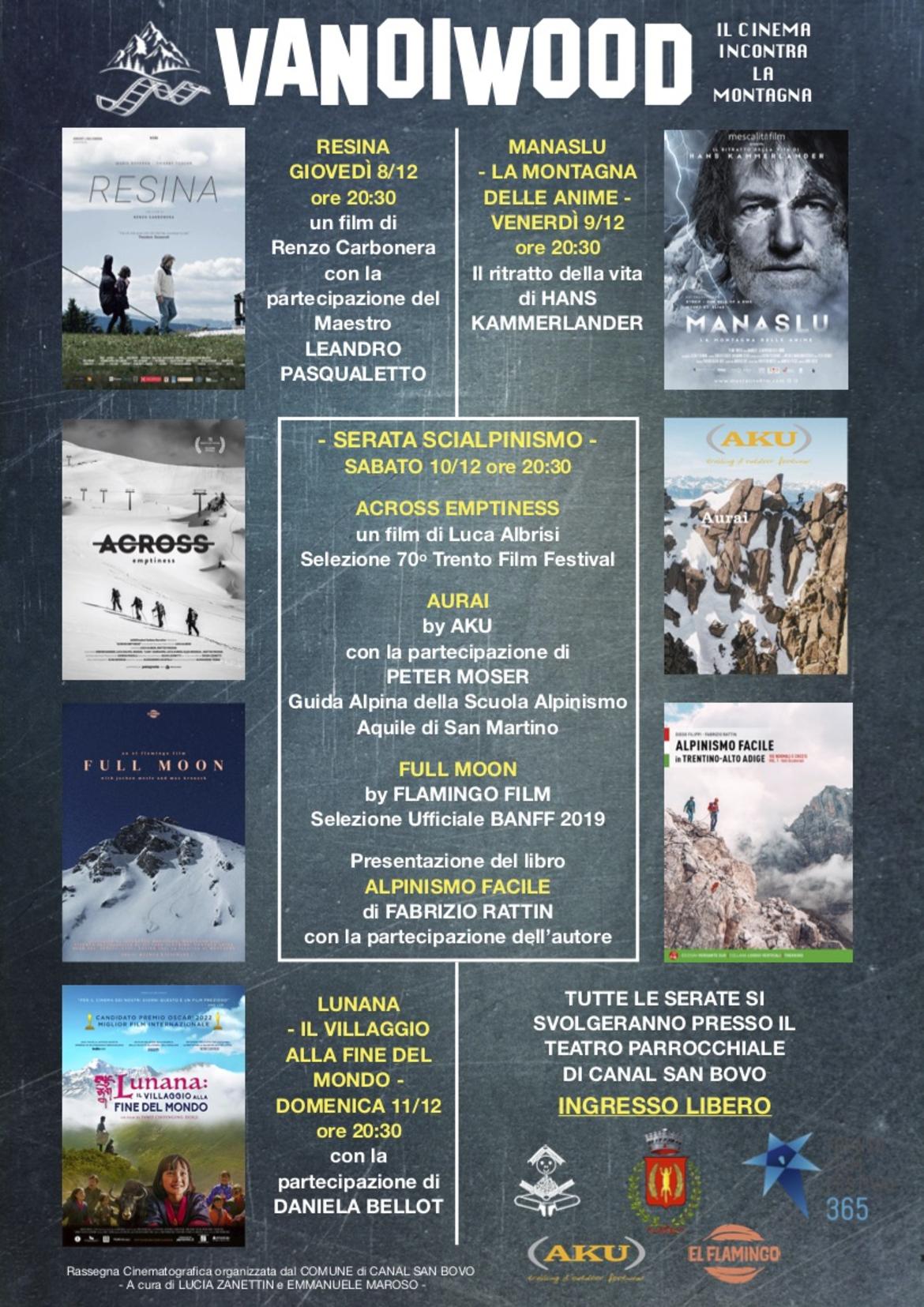 Rassegna cinematografica organizzata dal Comune di Canal San Bovo, a cura di Lucia Zanettin ed Emanuele Maroso e dedicata alla montagna, con pellicole selezionate al Trento Film Festival e al Banff, festival di film e libri di avventura, esplorazione e sport outdoor canadese.