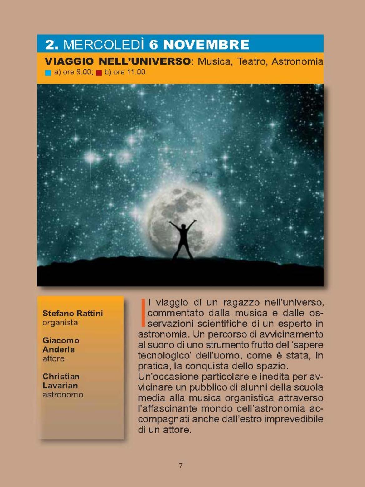 Il viaggio di un ragazzo nell’universo, commentato dalla musica e dalle osservazioni scientifiche di un esperto in astronomia. Un percorso di avvicinamento al suono di uno strumento frutto del ‘sapere tecnologico’ dell’uomo, come è stata, in pratica, la conquista dello spazio. Un’occasione particolare e inedita per avvicinare un pubblico di alunni della scuola media alla musica organistica attraverso l’affascinante mondo dell’astronomia accompagnati anche dall’estro imprevedibile di un attore.