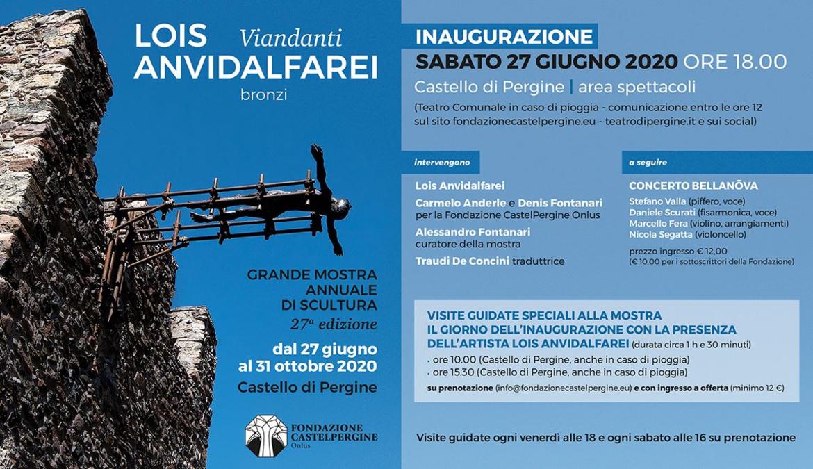 Una importante mostra di scultura, la 27a nella storia dell'arte in Castello: protagonista 2020 lo scultore sudtirolese Lois Anvidalfarei, di fama internazionale. Il titolo di questo grande progetto espositivo è "Viandanti", perché le statue in bronzo e i gruppi scultorei sono figure viandanti che ostentano l’uomo in cammino sulla terra, popolando le aree tra le due cinte murarie e alcuni suggestivi spazi interni.L’arte di Anvidalfarei, che si misura da sempre con la condizione umana, cerca per mezzo dei suoi corpi di bronzo il dialogo con le misure umane del Castello di Pergine, con le sue dimensioni architettoniche e storico-temporali.