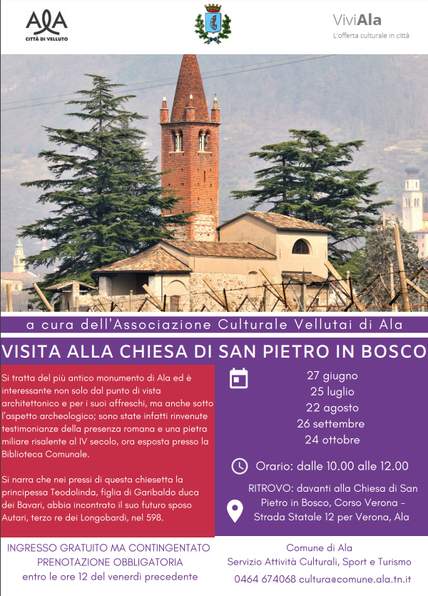 Si tratta del più antico monumento di Ala ed è interessante non solo dal punto di vista architettonico e per i suoi affreschi, ma anche sotto l’aspetto archeologico; sono state infatti rinvenute testimonianze della presenza romana e una pietra miliare risalente al IV secolo, ora esposta presso la Biblioteca Comunale.