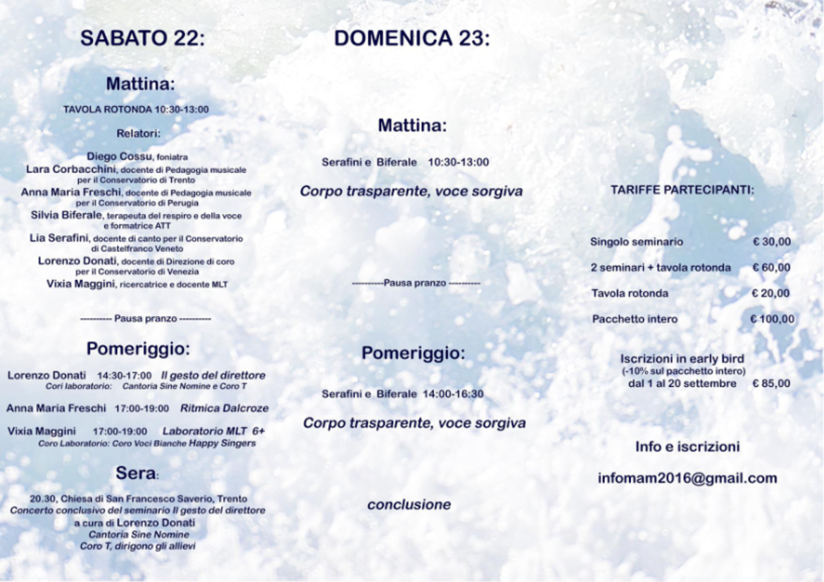 La giornata della domenica invece vedrà lavorare assieme per la prima volta Silvia Biferale e Lia Serafini: il loro lavoro sulla voce, pur sviluppandosi in ambiti molto diversi, sembra partire dagli stessi presupposti fisici di ascolto del proprio corpo. Lo hanno dimostrato le pubblicazioni di entrambe e per questo l’associazione MAM ha scommesso su un seminario a quattro mani che le docenti hanno accolto con entusiasmo. Nel loro Corpo trasparente, voce sorgiva, i partecipanti saranno guidati a trovare la propria voce a partire dal corpo: possono farlo tutti e per questo è aperto a tutti, non serve certo essere cantanti.