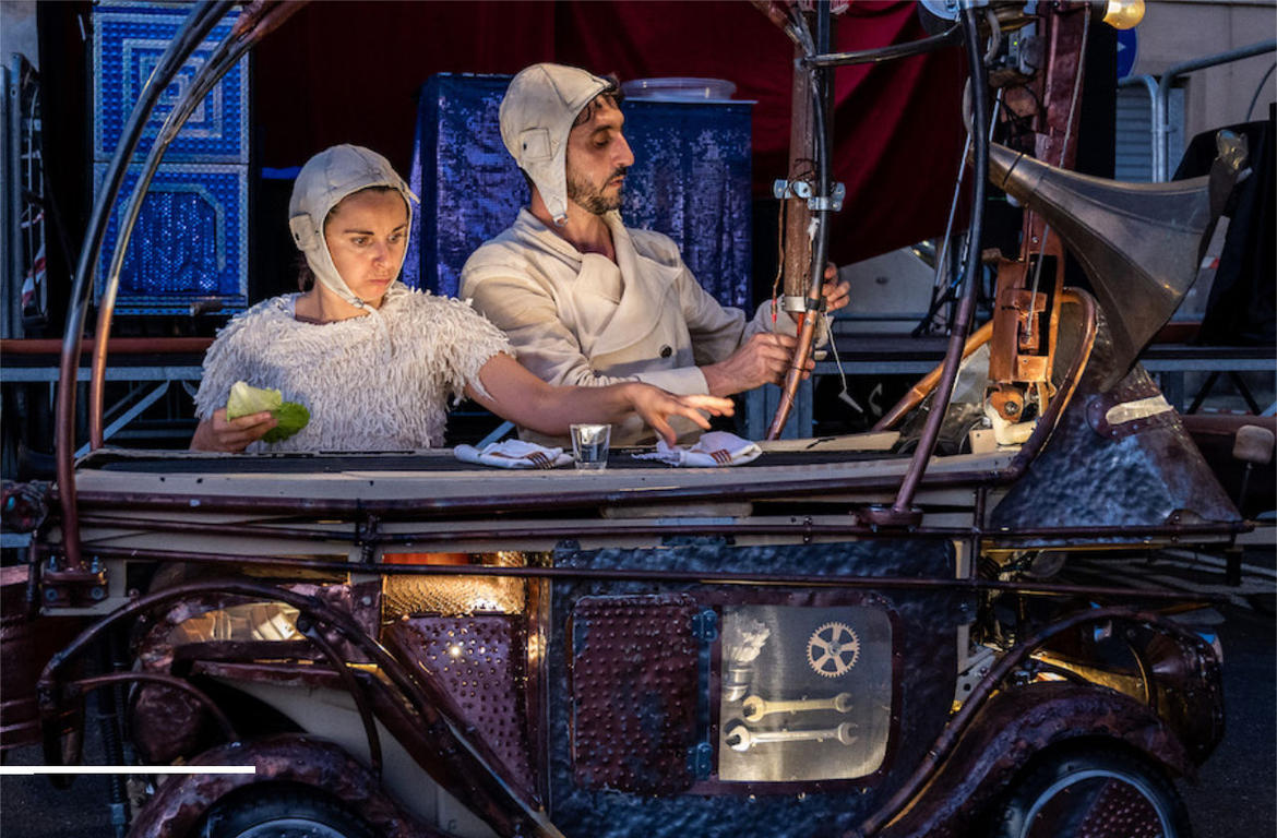 Una coppia di clown a bordo del loro bizzarro veicolo di rame e metallo, con ruote, motore e impianto audio, attraverserà le vie del Festival. All’apparenza sono due personaggi bizzarri e fuori dal comune, ma poi si scoprono ballerini, atleti, tra slapstick e giochi l’intento é far divertire il pubblico. Il loro veicolo è la loro casa e la piazza è il luogo ideale per prendersi una pausa durante il lungo viaggio. In questa sosta condivideranno un pò della loro visione del mondo fatta di gioco, movimento, danza e magia per poi partire verso la prossima destinazione a bordo del loro fantastico mezzo.