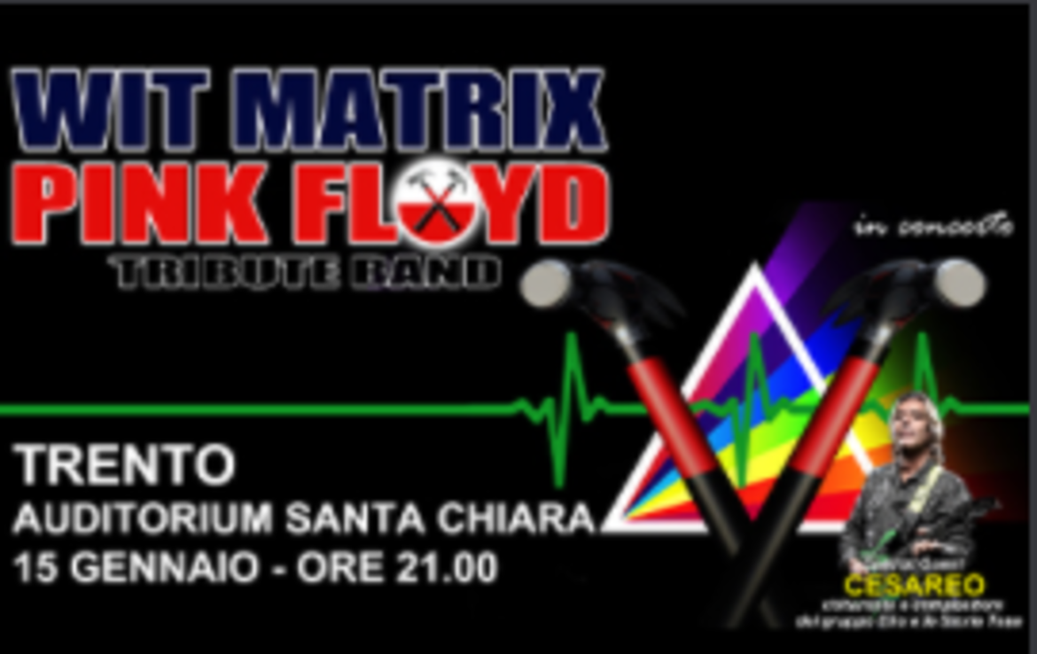 I WIT MATRIX, storica tribute band dei Pink Floyd, propongono uno spettacolo unico nel suo genere, famosiper la loro capacità di ricreare le particolari atmosfere che hanno reso celebre la mitica band britannica. Il gruppo, composto da 10 elementi e uno staff di professionisti, formato da tecnici Audio, video e luci, si presenta sul palco con suggestive scenografie, filmati video, effetti speciali e pirotecnici e un sound in perfetto stile Floydiano. Queste caratteristiche gli hanno permesso di varcare le frontiere e portare il loro tributo anche all’estero con grande consenso di critica e di pubblico, tanto da essere riconosciuti e apprezzati dai più critici e appassionati fans dei Pink Floyd.I WIT MATRIX godono della stima di molti big della musica Italiana e Internazionale, svariate sono le loro collaborazioni, alcune delle quali con: Harry Waters, musicista talentuoso, figlio del fondatore dei Pink Floyd, Roger Waters con cui ha suonato per 3 Tour mondiali Durga McBroom e Machan Taylor, le famose Pink Floyd Vocalist Cesareo del gruppo Elio e le Storie Tese Dodi Battaglia dei Pooh Ricky Portera, storico chitarrista di Lucio Dalla Ricky Belloni dei New Trolls Jennifer Batten, la famosa chitarrista di Michael Jackson.