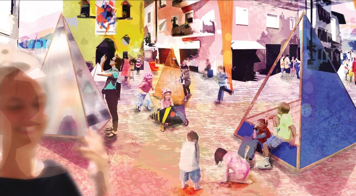 Come lo specchio di Alice nel Paese delle Meraviglie rappresenta la soglia per raggiungere un mondo nuovo, così il grande portale di accesso di piazza Gavazzi accoglie i visitatori di Pergine Festival in un viaggio urbano alla scoperta dell’inatteso. Un’installazione di elementi compositi, come cubi e piramidi, che dalla strada al cielo regalano nuova luce e inedite prospettive della città.