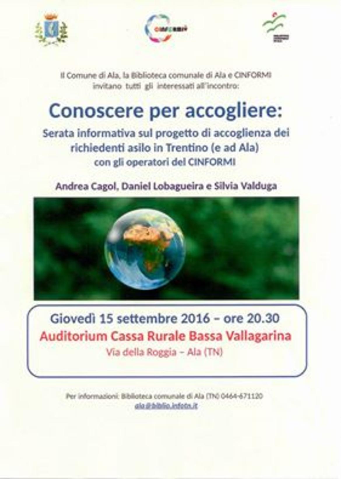 Quanti sono i migranti forzati accolti in Trentino? Quali sono i servizi offerti? Quanto realmente si spende per l'accoglienza e come? Da quali soggetti è composta la rete dell'accoglienza? Si parlerà di questo e di molto altro ancora questa sera all'Auditorium Cassa Rurale Bassa Vallagarina di Ala (ore 20.30) durante la serata informativa Conoscere per accogliere organizzata dal Comune, dalla Biblioteca e dal Cinformi. Un'occasione per capirne di più di un tema drammaticamente attuale e alquanto scottante e per sfatare “falsi miti”, primo fra tutti i 30 euro al giorno che i profughi riceverebbero.
