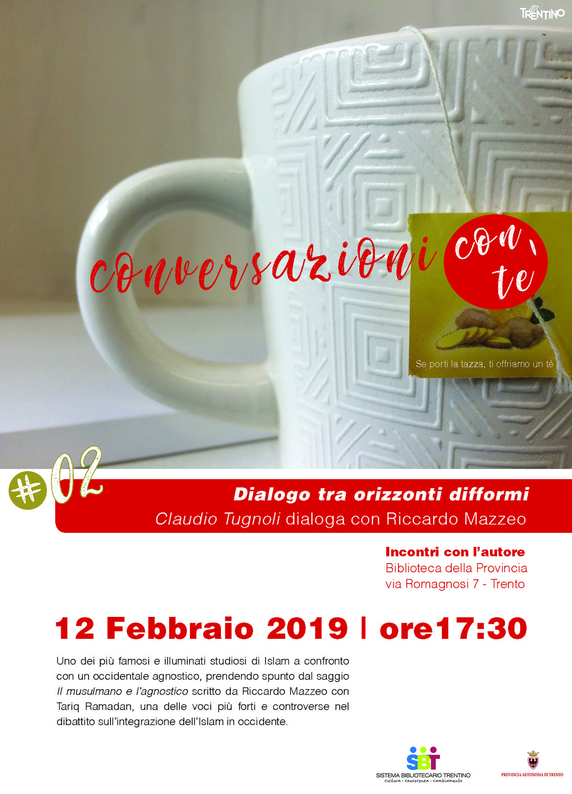 Martedì 12 febbraio in Biblioteca della Provincia Riccardo Mazzeo e Claudio Tugnoli prendendo spunto dal saggio Il musulmano e l'agnostico, daranno vita a un denso dialogo sulla possibilità di una "coesistenza positiva" tra musulmani e occidentali.