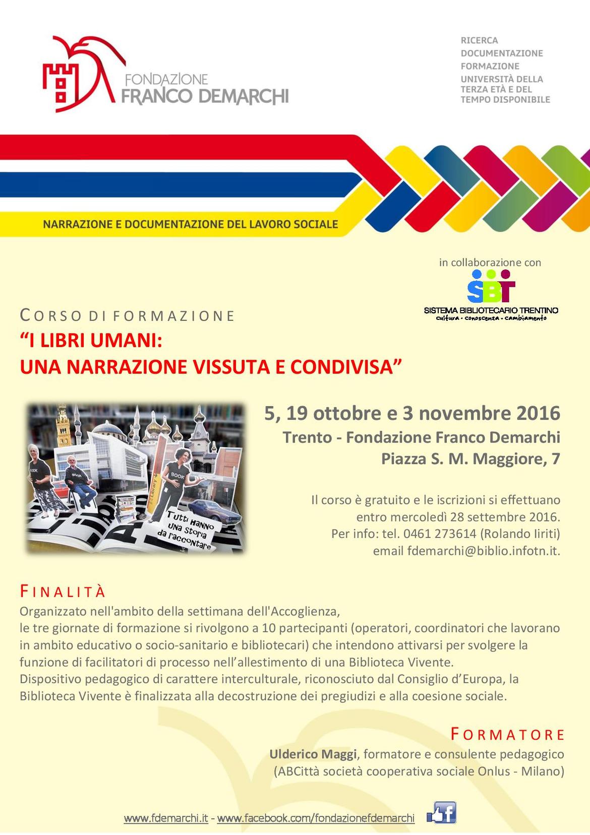 Il 5 ottobre prenderà il via un corso di formazione intitolato I libri umani: una narrazione vissuta e condivisa, al fine di definire un gruppo funzionale al progetto della Biblioteca vivente. Gratuito e della durata di 21 ore suddivise in tre giornate (5 ottobre – 19 ottobre – 3 novembre), si rivolge a 10 operatori, coordinatori che lavorano in ambito educativo e socio sanitario e ai bilbiotecari.
