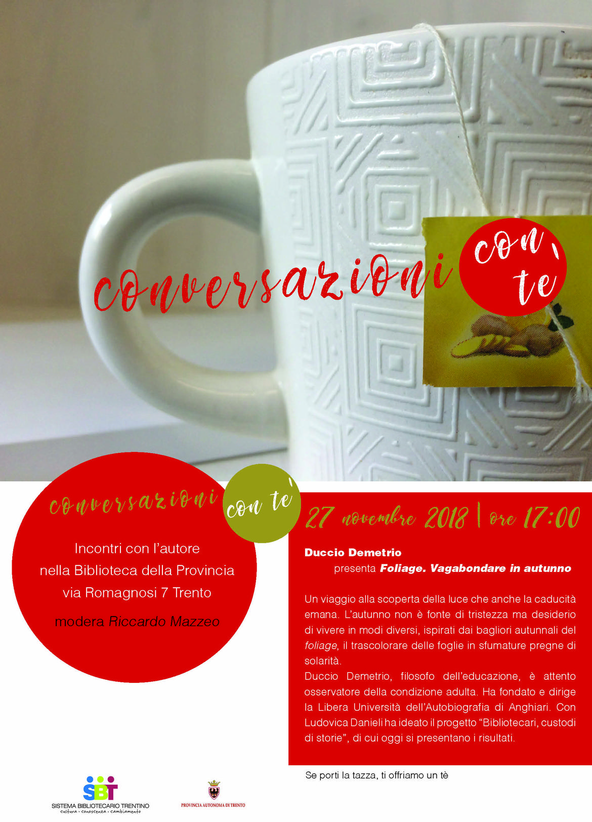 Martedì 27 novembre ad ore 17,00 in Biblioteca della Provincia, Duccio Demetrio converserà con Riccardo Mazzeo a proposito del suo ultimo libro Foliage. Vagabondare in autunno. Un viaggio alla scoperta della luce che anche la caducità emana. L’autunno non è fonte di tristezza ma desiderio di vivere in modi diversi, ispirati dai bagliori autunnali del foliage, il trascolorare delle foglie in sfumature pregne di solarità.