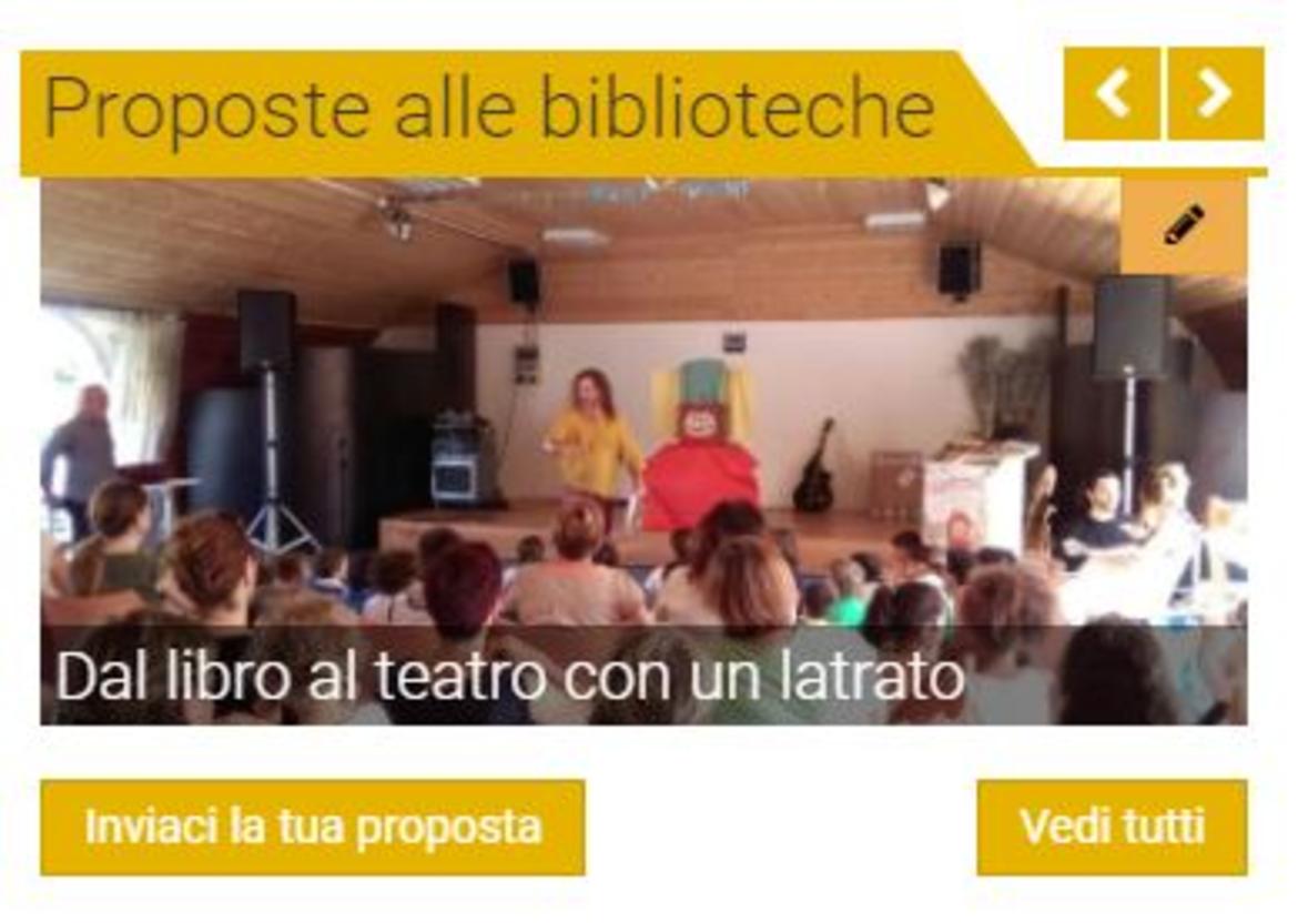 Così recita la sezione Proposte alle biblioteche del sito www.cultura.trentino.it/Biblio. E’ uno spazio dedicato alle biblioteche del Sistema bibliotecario trentino offerto agli operatori per promuovere attività ed iniziative. Una nuova opportunità di partecipazione e di collaborazione fra soggetti per promuovere la cultura.