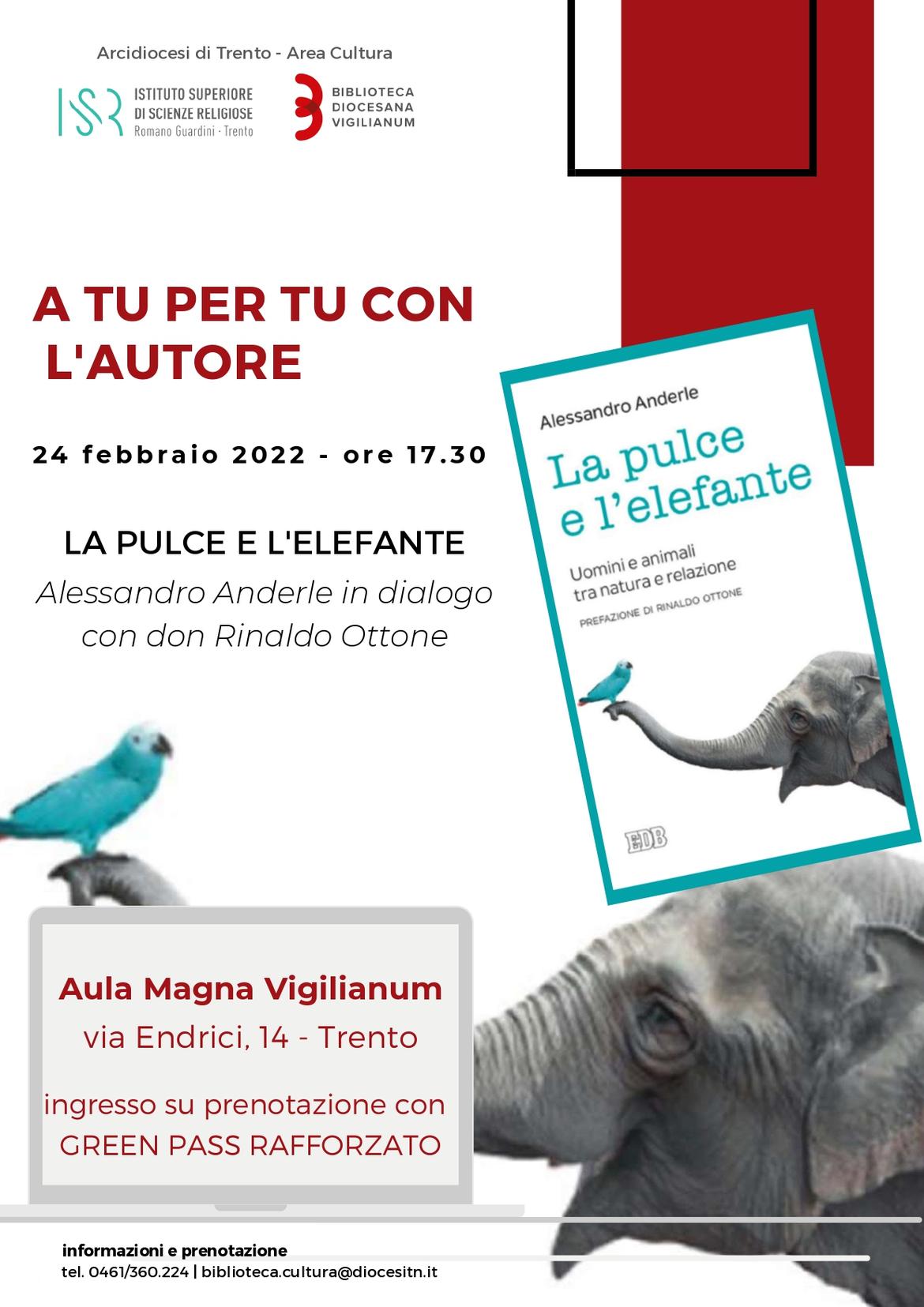 Alessandro Anderle, autore di "La pulce e l'elefante" dialogherà con don Rinaldo Ottone. Il tema del volume è l’affascinante rapporto uomo-animale. Nel mondo animale si cela per il mondo umano l’opportunità di riconoscersi abitanti della stessa realtà e per ricordarci che la Verità la si trova nella relazione, che essa è relazione.