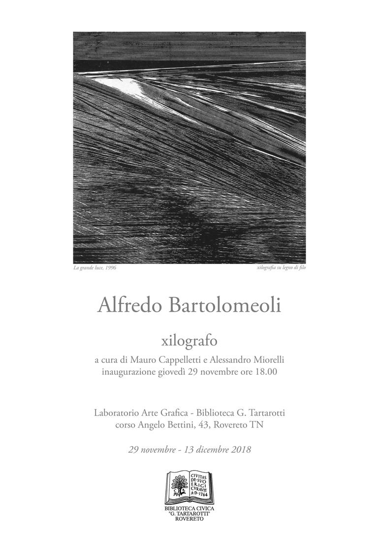 Alfredo Bartolomeoli (Urbino 1950). Allievo di Bruscaglia e Piacesi, già docente dal 1984 della cattedra di xilografia presso l’Istituto statale di Urbino, presenta dal 29 novembre al 13 dicembre, presso il laboratorio arte grafica della biblioteca Tartarotti di Rovereto, una significativa selezione dei suoi fogli xilografici con tematiche legate anche all’affascinante paesaggio marchigiano. Numerose le esposizioni in Italia e all’estero; tra queste vanno ricordate, nel gennaio 2003 la collettiva tenutasi nella nuova sede della biblioteca di Alessandria d’Egitto, la personale tenuta nell’aprile del 2003 a Saragozza. E’ tra i soci fondatori dell’Associazione “La luna”, per cui ha collaborato per la realizzazione di cartelle e volumi di autori e poeti del calibro di Zimborska, Carlo Bo, Paolo Volponi, Eugenio De Signoribus. E’ stato nel 1995 docente del Corso di grafica Internazionale a Palma de Mallorca, presso la Fondazione Mirò. Ha tenuto inoltre corsi di incisione per studenti e docenti presso la Escuela de bellas artes di Saragozza ed ha ricoperto l’incarico di direttore tecnico dei Corsi estivi internazionali per l’incisione artistica di Urbino.