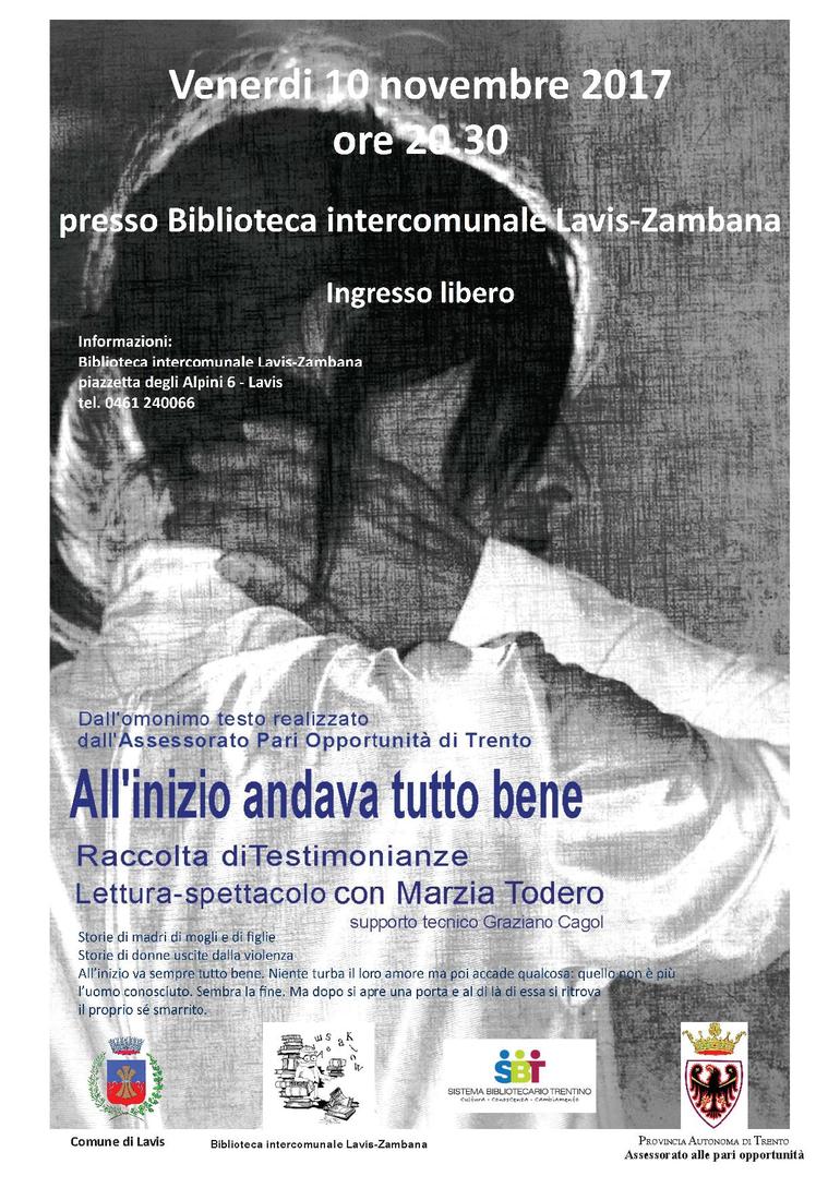 La lettura-spettacolo consiste nell’adattamento drammaturgico della raccolta di testimonianze di donne maltrattate, curata dall’Osservatorio sulle violenze di genere e pubblicate dall’Assessorato per le Pari Opportunità di Trento nella raccolta dal titolo “All’inizio andava tutto bene”.