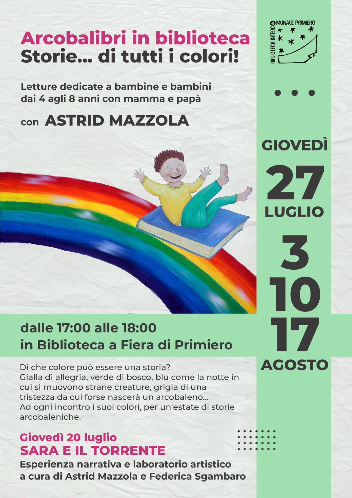 La Biblioteca di Primiero propone per l’estate a bambine e bambini dai 4 agli 8 anni, accompagnati da mamma e papà, una serie di appuntamenti condotti da Sarà Astrid Mazzola, scrittrice e fine lettrice, che, grazie a incantevoli letture e canzoni originali, ci condurrà ogni volta in un colore diverso.