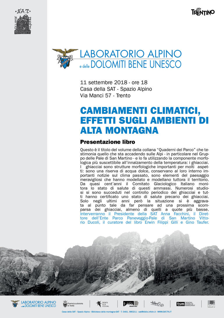 Presenzieranno all’evento il Presidente della SAT Anna Facchini, il Direttore dell’Ente Parco Paneveggio-Pale di San Martino Vittorio Ducoli, il curatore del libro Erwin Filippi Gilli e Gino Taufer del Parco Naturale Paneveggio Pale di San Martino e Operatore glaciologico del CGI.