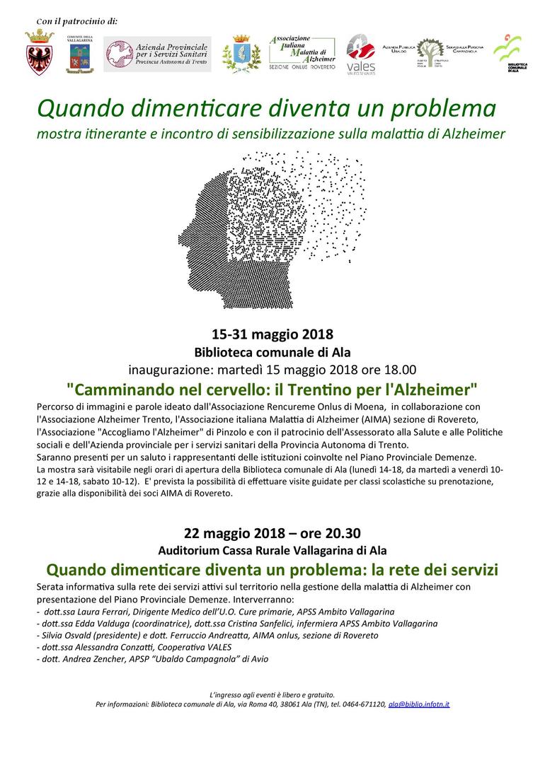 organizzazione: Comune di Ala, Ufficio biblioteca e archivio storico; AIMA onlus sezione di Rovereto; con la collaborazione di APSP "Ubaldo Campagnola" di Avio, APSS Ambito Vallagarina, Coop. VALES