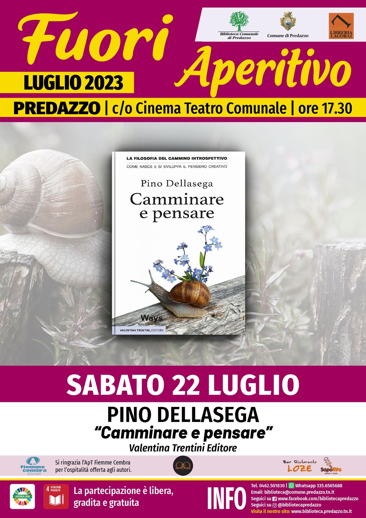 Pino Dellasega presenterà il suo ultimo libro “Camminare e pensare” (Valentina Trentini Editore), una riflessione sul fatto che ciò che eleva lo spirito di un viaggiatore è la capacità di entrare nell’anima dei luoghi e delle genti che incontra lungo il suo peregrinare.