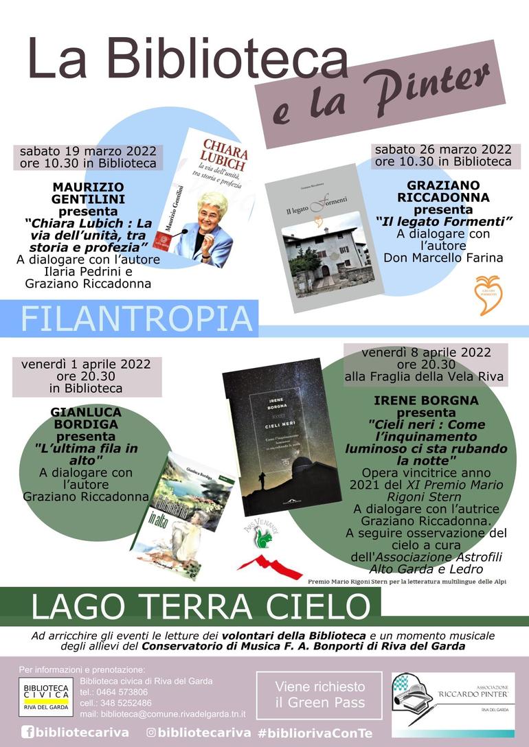Dalla collaborazione della Biblioteca civica di Riva del Garda e l'Associazione "Riccardo Pinter" nascono quattro incontri con l'autore suddivisi in due filoni: FILANTROPIA e LAGO TERRA CIELO