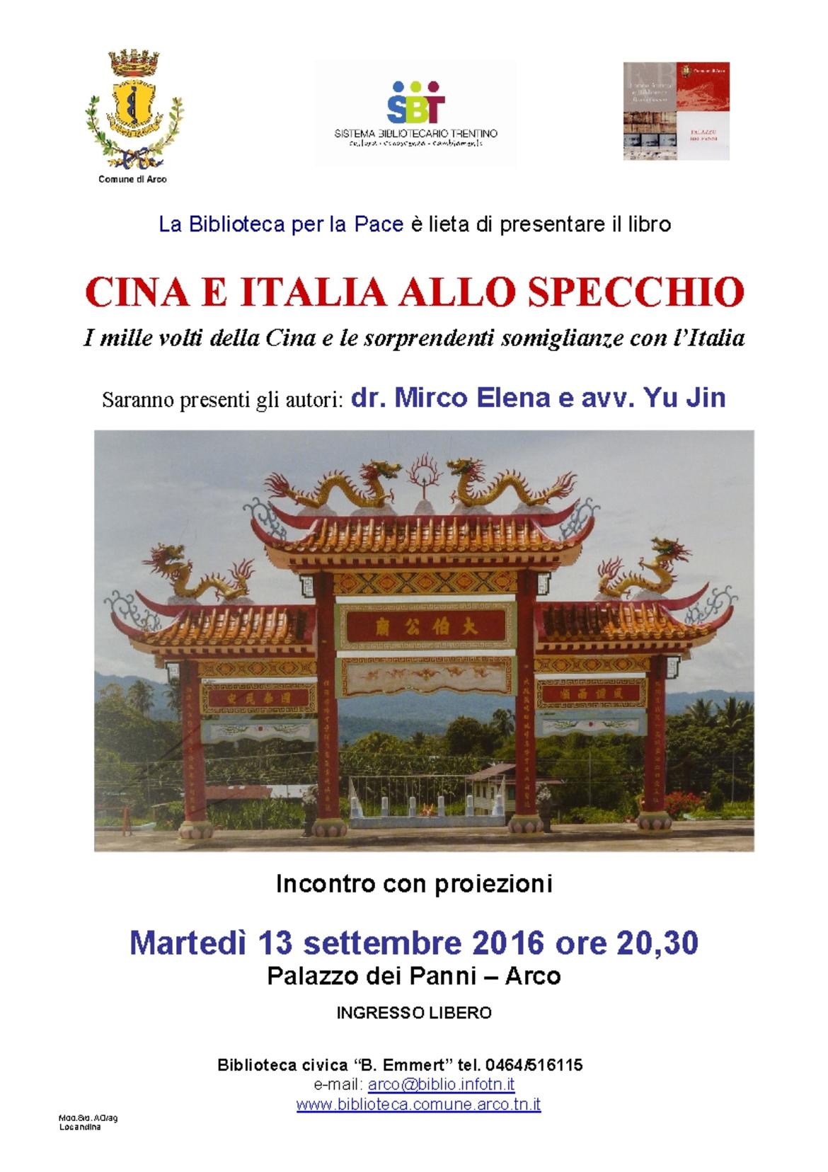 Un inedito parallelismo tra due Paesi soltanto all’apparenza tanto diversi tra loro. Di questo si parlerà nelle sale della biblioteca di Palazzo dei Panni, nel corso della presentazione del libro “Cina e Italia allo specchio”, serata organizzata dal Comune di Arco, Biblioteca di Arco e con SBT (Sistema Bibliotecario Trentino). Saranno presenti gli autori Mirco Elena e Yu Jin, che racconteranno il percorso che ha portato alla pubblicazione di questo volume.