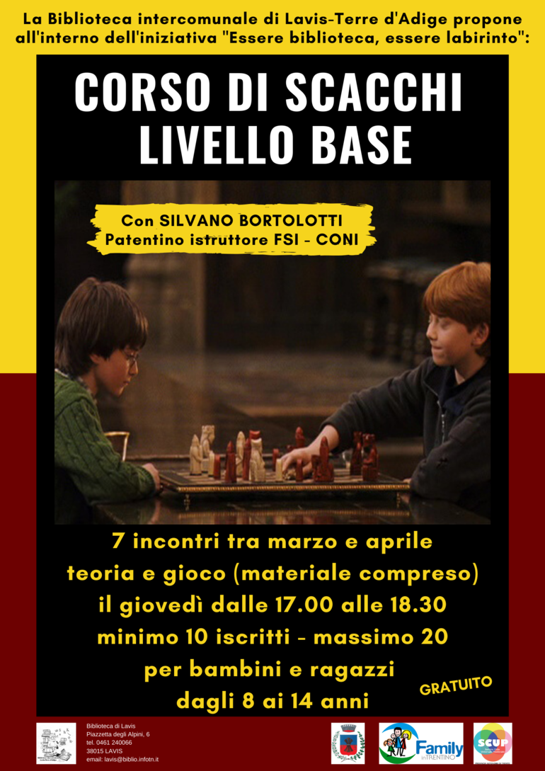 Primo appuntamento del corso di scacchi livello base tenuto da Silvano Bortoletti, istruttore certificato CONI-FSI, proposto dalla biblioteca intercomunale di Lavis-Terre d'Adige all'interno dell'iniziativa "Essere biblioteca, essere labirinto".