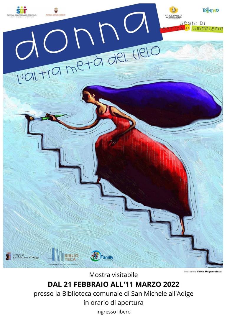 Selezione di opere della 26. edizione della Rassegna internazionale di satira e umorismo, curata dallo studio d'arte Andromeda. La mostra, esposta nelle biblioteche del Sistema trentino, offre riflessioni romantiche, descrizioni amare, spicchi di realtà sull’“altra meta del cielo”. Talvolta le immagini diventano conferma di ripetuti cliché, talvolta pungente manifesto di denuncia e desiderio di riscatto che, attraversando i confini, puntano univocamente agli stessi obiettivi. Indicativo è il fatto che, pur passando da un capo all’altro del pianeta, alla figura femminile si attribuiscono i medesimi significati in luoghi totalmente distanti e differenti.