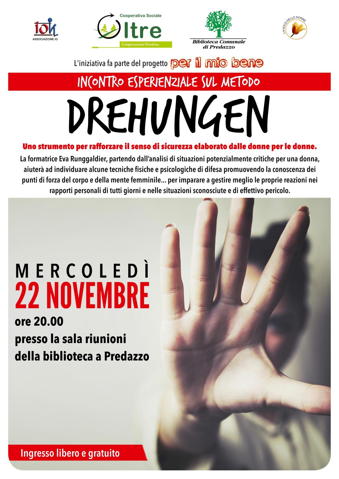 In occasione della Giornata internazionale per l’eliminazione della violenza contro le donne. la biblioteca comunale di Predazzo propone un incontro esperienziale sul metodo “Drehungen”, uno strumento per rafforzare il senso di sicurezza elaborato dalle donne per le donne, a cura della Cooperativa Oltre e della biblioteca di Predazzo, in collaborazione con le associazioni La Voce delle Donne e l’associazione IO.