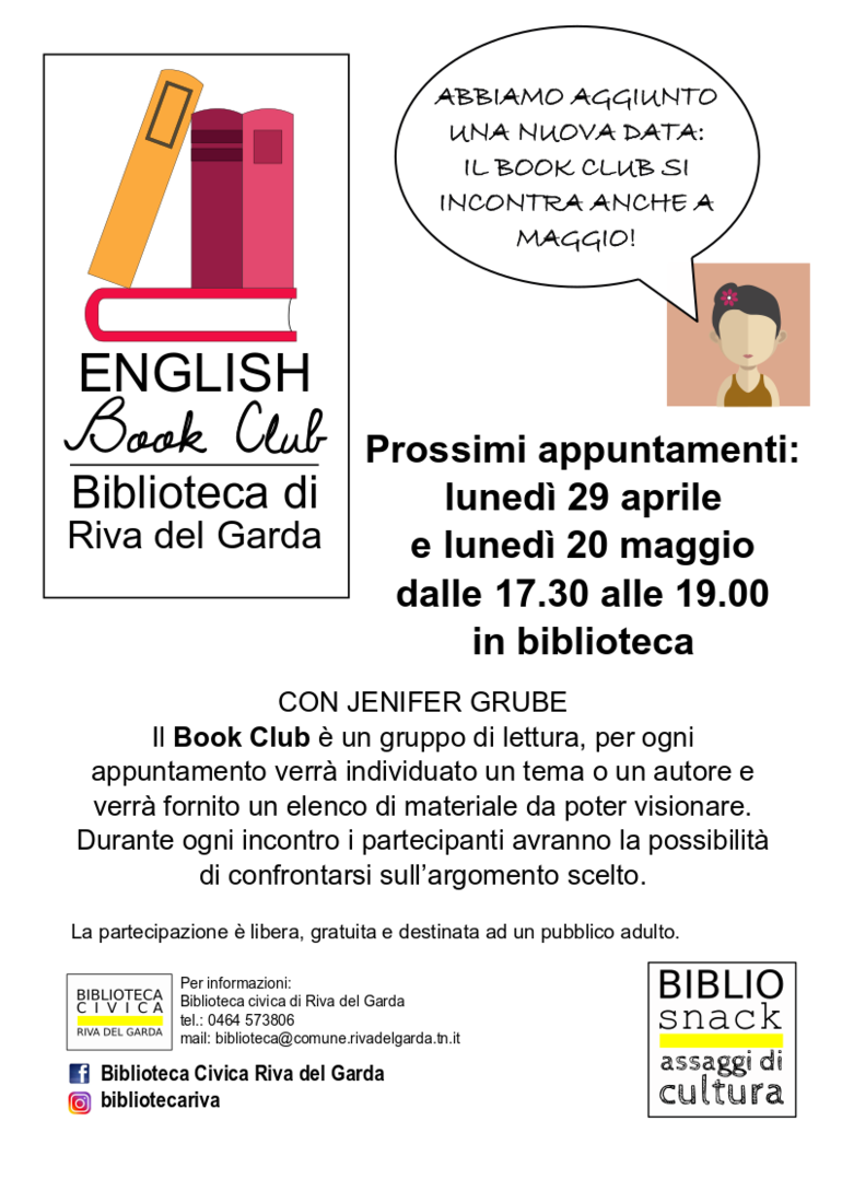 Il Book club è un gruppo di lettura, per ogni appuntamento verrà individuato un tema o un autore e verrà fornito un elenco di materiale da poter visionare. Durante ogni incontro i partecipanti avranno la possibilità di confrontarsi sull'argomento scelto.