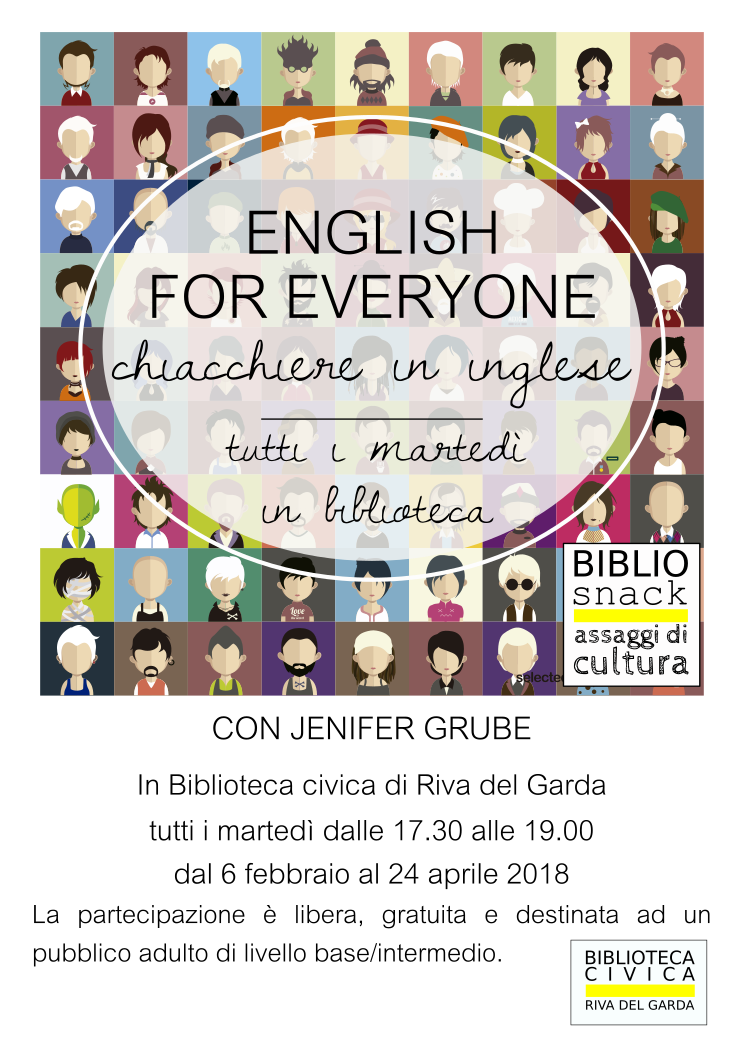 Gli appuntamenti di English for everyone sono dedicati ad un pubblico adulto di livello base/intermedio, la partecipazione è libera e gratuita. Durante gli incontri Jenifer si avvarrà di supporti quali riviste e audiovisivi in lingua originale.