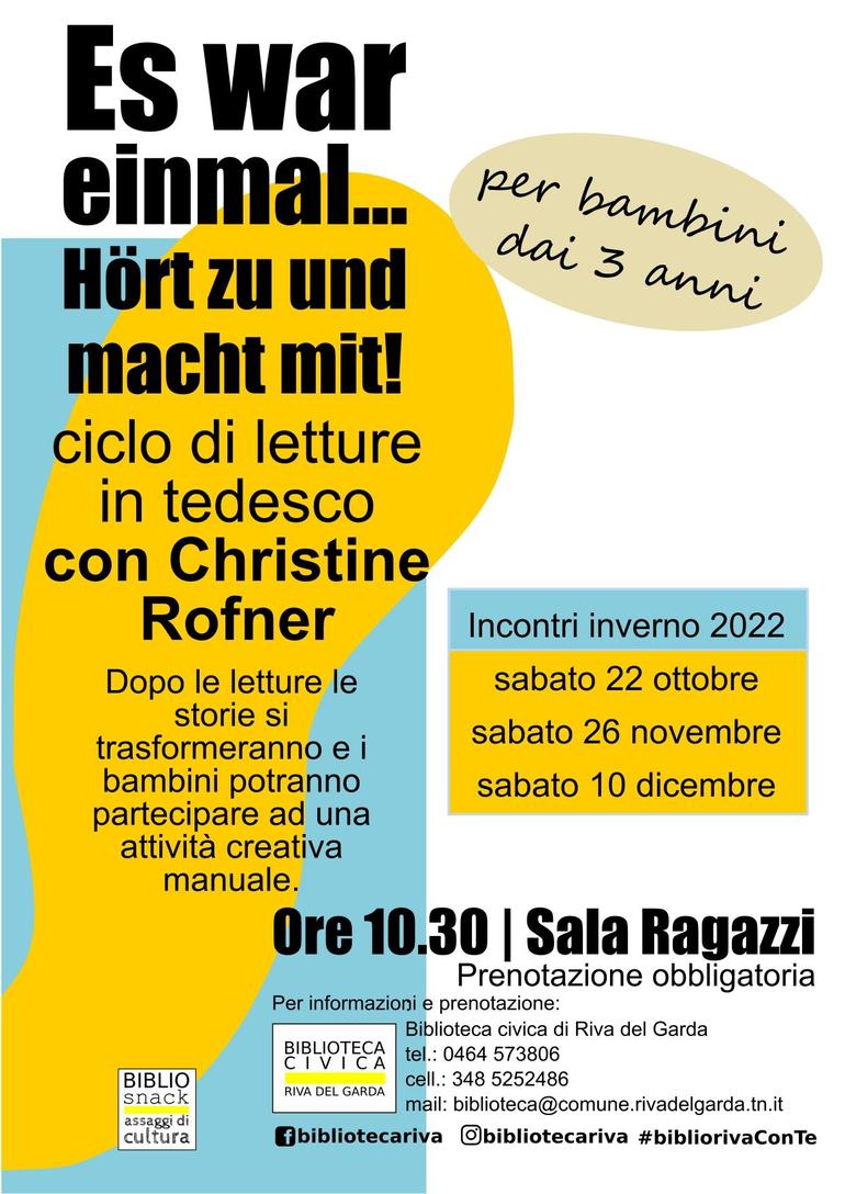 Proseguono in biblioteca le letture in tedesco dedicate ai bambini dai tre anni, condotte da Christine Röfner. Un'occasione per entrare in contatto con una nuova lingua tramite l'ascolto di bellissime storie.