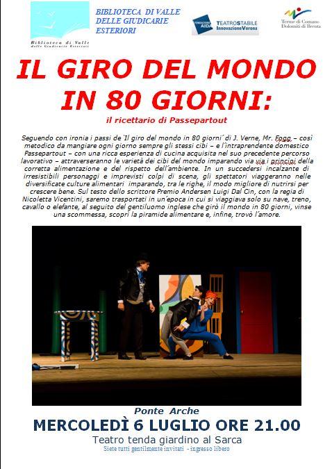 Seguendo con ironia i passi de ‘Il giro del mondo in 80 giorni’ di J. Verne, Mr. Fogg – così metodico da mangiare ogni giorno sempre gli stessi cibi – e l’intraprendente domestico Passepartout – con una ricca esperienza di cucina acquisita nel suo precedente percorso lavorativo – attraverseranno le varietà dei cibi del mondo imparando via via i princìpi della corretta alimentazione e del rispetto dell’ambiente. In un succedersi incalzante di irresistibili personaggi e imprevisti colpi di scena, gli spettatori viaggeranno nelle diversificate culture alimentari imparando, tra le righe, il modo migliore di nutrirsi per crescere bene. Sul testo dello scrittore Premio Andersen Luigi Dal Cin, con la regia di Nicoletta Vicentini, saremo trasportati in un’epoca in cui si viaggiava solo su nave, treno, cavallo o elefante, al seguito del gentiluomo inglese che girò il mondo in 80 giorni, vinse una scommessa, scoprì la piramide alimentare e, infine, trovò l’amore.