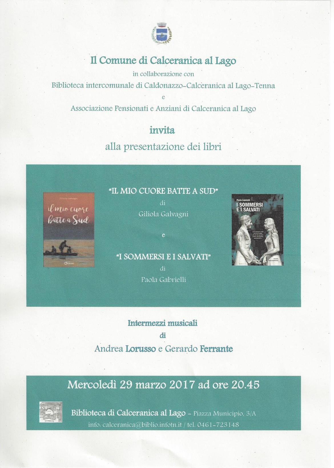 Il Comune di Calceranica al Lago in collaborazione con la Biblioteca intercomunale di Caldonazzo-Calceranica al Lago-Tenna e l'Associazione pensionati e anziani di Calceranica al Lago organizza l'incontro di presentazione dei libri Il mio cuore batte a sud di Giliola Galvagni e I sommersi e i salvati di Paola Gabrielli.