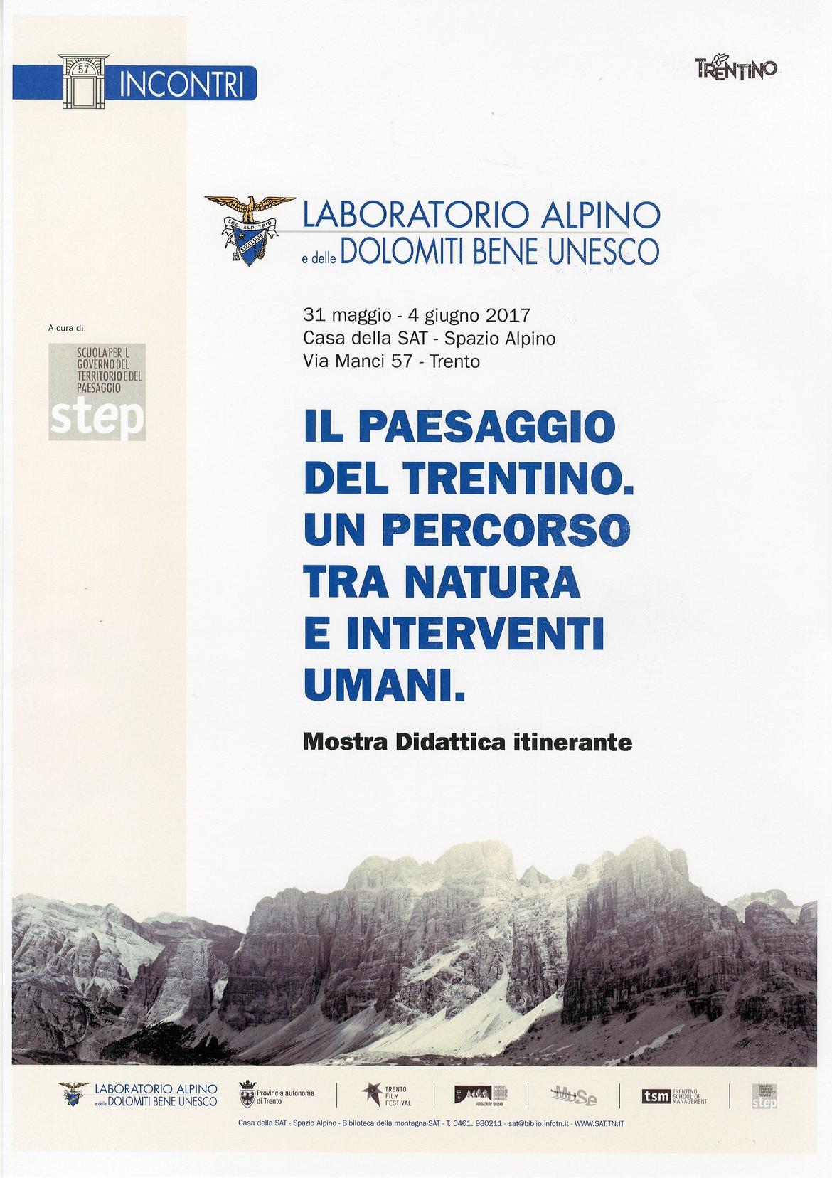 La mostra didattica itinerante, progettata per le scuole secondarie di primo e secondo grado della provincia di Trento, propone uno sguardo d’insieme sul paesaggio del Trentino. L’esposizione compone un quadro sintetico tanto degli aspetti materiali del paesaggio quanto dei significati che i diversi elementi che lo compongono assumono per le singole comunità. I quindici pannelli propongono, dopo una domanda introduttiva sul perché ci interessa e ci emoziona il paesaggio, una sintesi delle componenti naturali (sia di natura geologica e morfologica sia relative agli ecosistemi) e una lettura dei caratteri del paesaggio trasformato dall’uomo (lo spazio agricolo, gli insediamenti, l’ambiente urbano, i giardini e i parchi, gli edifici). Il quadro tracciato consente di individuare i principali valori attribuiti al paesaggio e di esporre gli strumenti impiegati per la conservazione e la valorizzazione. L’obiettivo dell’iniziativa è educativo e divulgativo con la speranza di restituire a tutta la comunità trentina un tema decisivo per la storia e per il futuro.
