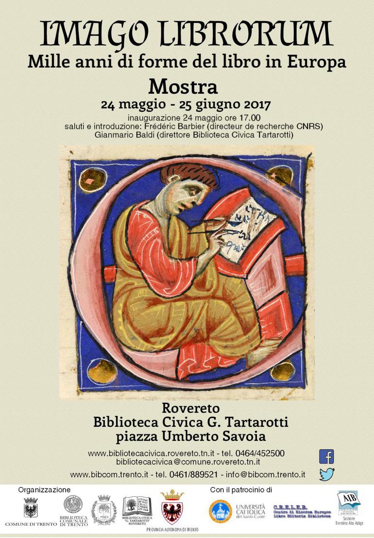 La mostra Imago librorum organizzata presso la Biblioteca Civica “G. Tartarotti” di Rovereto si pone in connessione con l’omonimo convegno che si tiene a Palazzo Geremia di Trento nei giorni 25 e 26 maggio. Nato in stretta collaborazione con la Biblioteca Comunale di Trento, con il sostegno anche della Soprintendenza per i Beni Culturali della Provincia Autonoma di Trento, il progetto intende mettere al centro il libro quale oggetto materiale protagonista dell’ultimo millennio della storia dell’Europa occidentale. L’esposizione, costituita dal prezioso materiale messo a disposizione dalle due biblioteche, vuole documentare alcuni tratti e aspetti di questa straordinaria vicenda.
