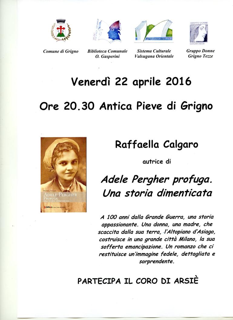 L'Assessorato alla Cultura, la Biblioteca Comunale O. Gasperini e l'Associazione Gruppo Donne Grigno Tezze hanno il piacere di invitarvi alla presentazione del libro "Adele Pergher profuga. Una storia dimenticata" di Raffaella Calgaro. Interviene l'autrice. Parteciperà il Coro di Arsiè