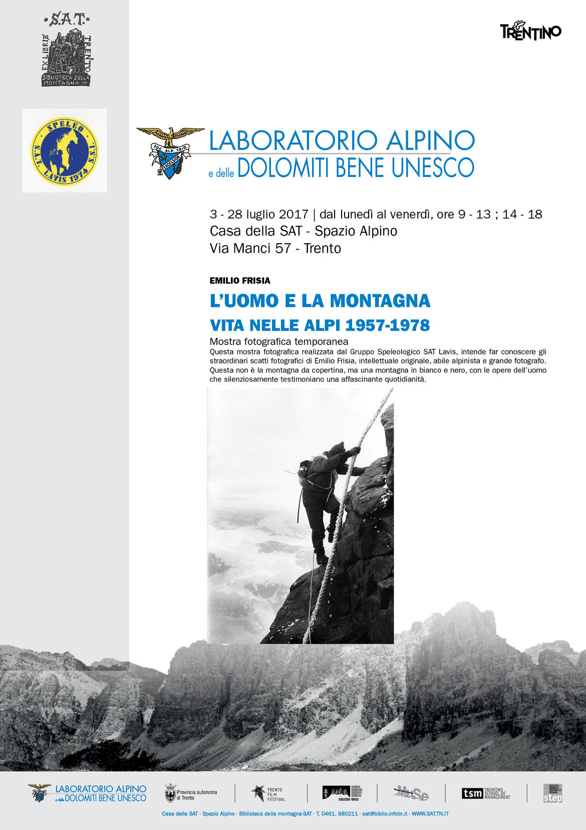 Questa mostra fotografica realizzata dal GruppoSpeleologico SAT Lavis, intende far conoscere gli straordinari scatti fotografici di Emilio Frisia, intellettuale originale, abile alpinista e grande fotografo. Dopo una prima esposizione a Lavis tra novembre e dicembre dell’anno scorso, queste fotografie arrivano a Trento, nella Casa della SAT, luogo ideale per apprezzare l’arte di Frisia, fatta di capacità tecnica, competenza e sensibilità. Questa non è la montagna da copertina, quella talvolta sopra le righe, ma una montagna in bianco e nero, con le opere dell’uomo che silenziosamente testimoniano una affascinante quotidianità.