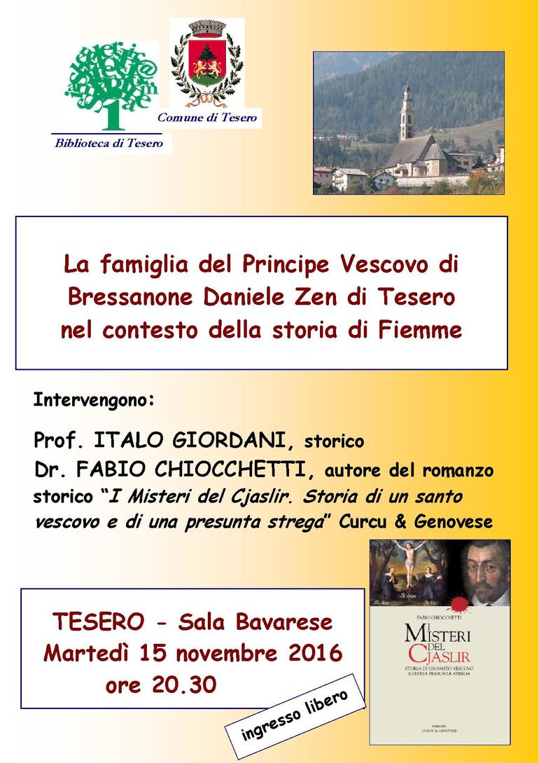 Nel corso della serata, il prof. Italo Giordani parlerà della famiglia teserana Zen (distinta dalla famiglia Zeni), ed in particolare di Pietro, padre del vescovo Daniele . Il dr. Fabio Chiocchetti illustrerà il suo lavoro sul personaggio e racconterà della sua “avventura letteraria” per la stesura di questo romanzo.