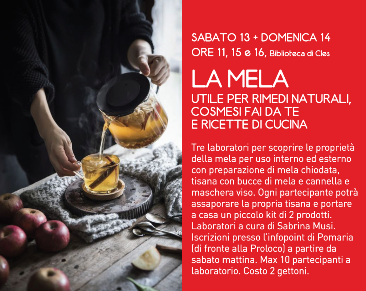 Tre laboratori per scoprire le proprietà della mela per uso interno ed esterno con preparazione di mela chiodata, tisana con bucce di mela e cannella e maschera viso.