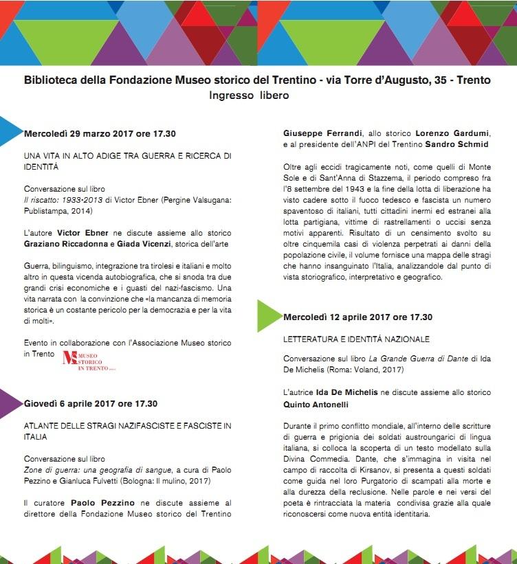 Il curatore Paolo Pezzino ne discute assieme al direttore della Fondazione Museo storico del Trentino Giuseppe Ferrandi, allo storico Lorenzo Gardumi, e al presidente dell’ANPI del Trentino Sandro Schmid.
