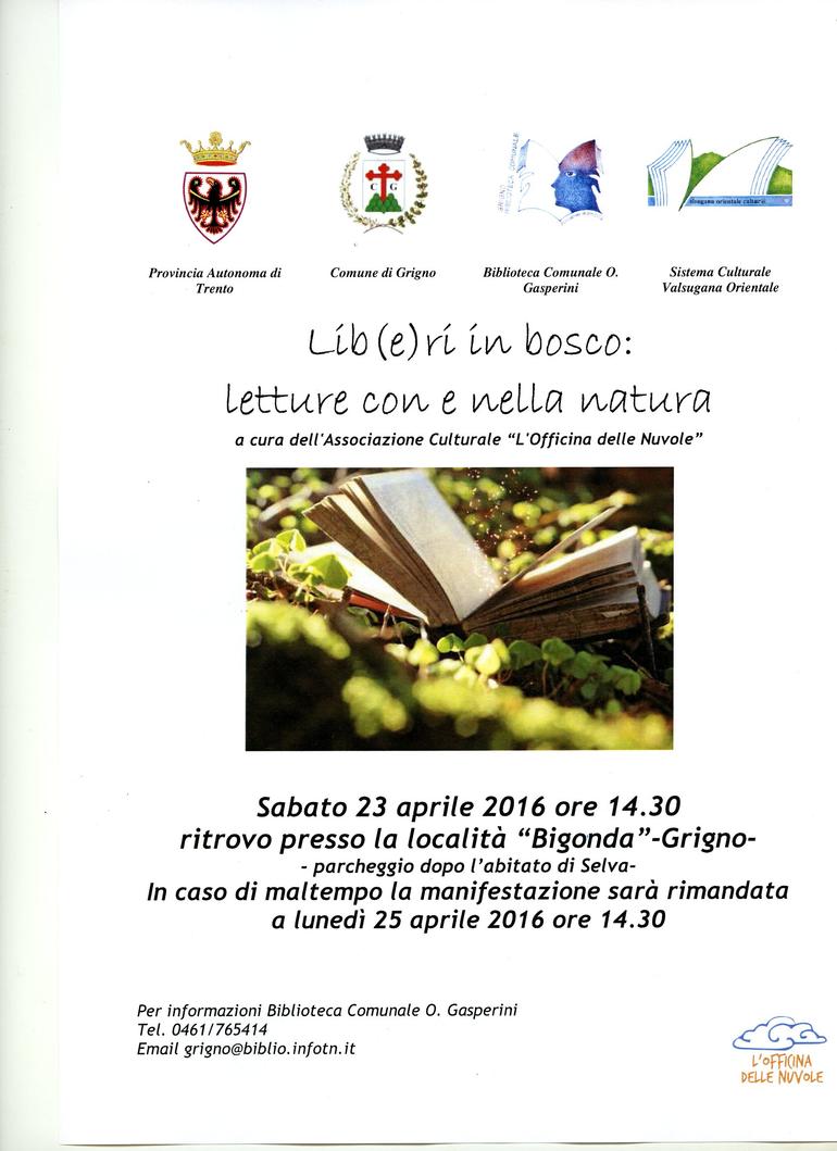 La Biblioteca Comunale O. Gasperini e l'associazione Culturale "L'Officina delle Nuvole" vi danno appuntamento sabato 23 aprile alle ore 14.30 in località Bigonda di Grigno per una passeggiata tra la natura, la lettura e la musica. Via spettiamo numerosi
