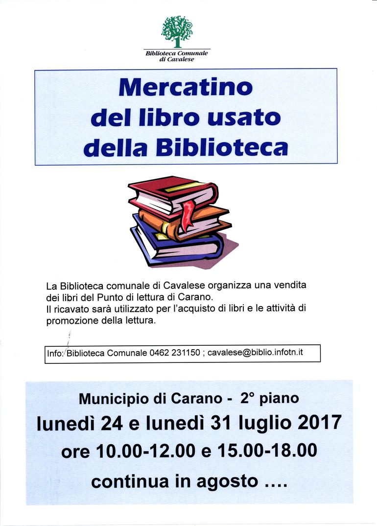 La Biblioteca di Cavalese organizza una vendita del libri del Punto di lettura di Carano, chiuso a febbraio 2017.