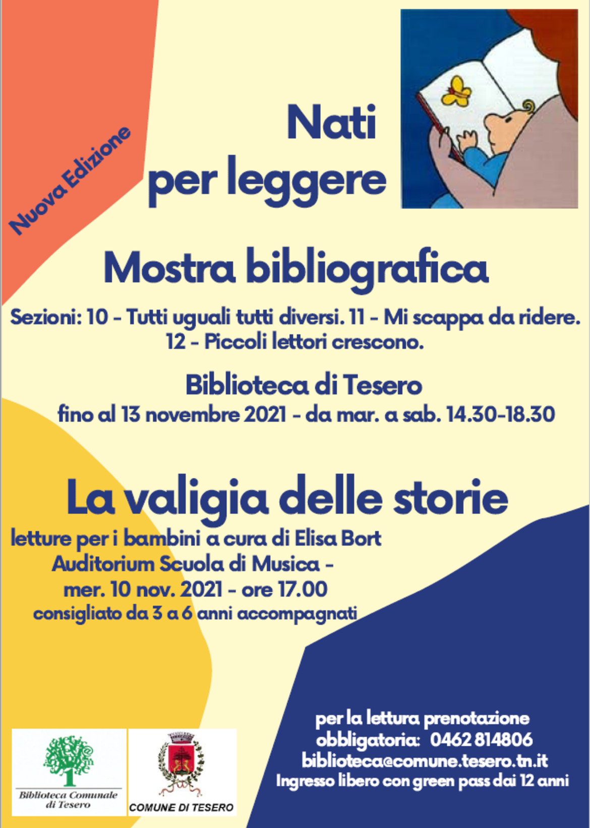 Sono le sezioni della Mostra bibliografica itinerante NATI PER LEGGERE n. 6 che saranno in biblioteca a Tesero fino a sabato 13 novembre 2021.