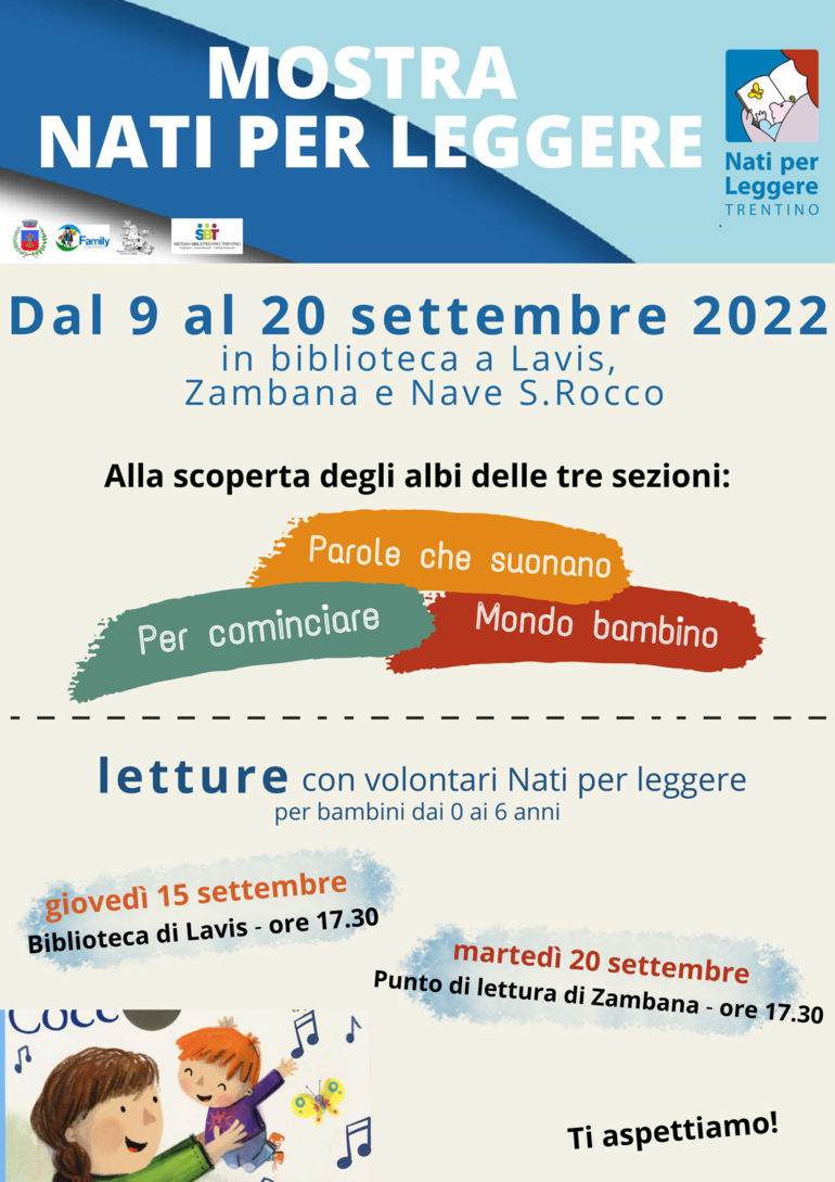 Dal 9 al 20 settembre la Biblioteca di Lavis e i Punti di lettura di Zambana e di Nave S.Rocco ospiteranno durante i loro orari di apertura la mostra dei libri delle sezioni "Per cominciare", "Parole che suonano" e "Mondo bambino" del progetto Nati per Leggere.