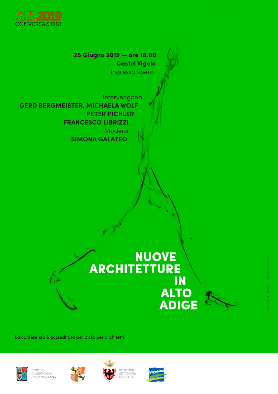 L’evento rientra nella manifestazione “Conversazioni a Castel Vigolo 2019”, diretta da Antonio Tabarelli de Fatis, in collaborazione con Comune di Altopiano della Vigolana e Provincia Autonoma di Trento, col patrocinio dell’Ordine degli Architetti di Trento.
