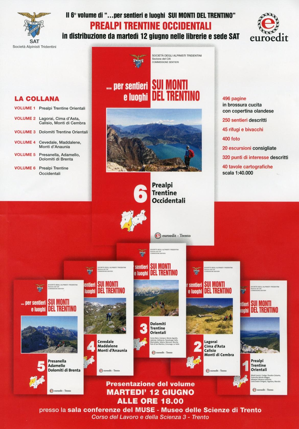 Presentazione del 6° e ultimo volume della collana Per sentieri e luoghi sui monti del Trentino, che descrive le Prealpi trentine occidentali con 400 foto e moltissime informazioni su sentieri, monti e località della zona. L'opera è stata realizzata dalla Commissione Sentieri della SAT.