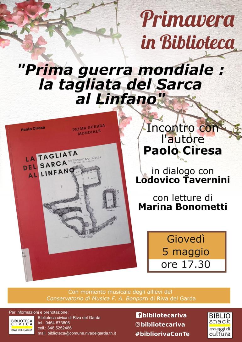 Paolo Ciresa presenta "Prima guerra mondiale : la tagliata del Sarca al Linfano" in dialogo con Lodovico Tavernini e con letture di Marina Bonometti.