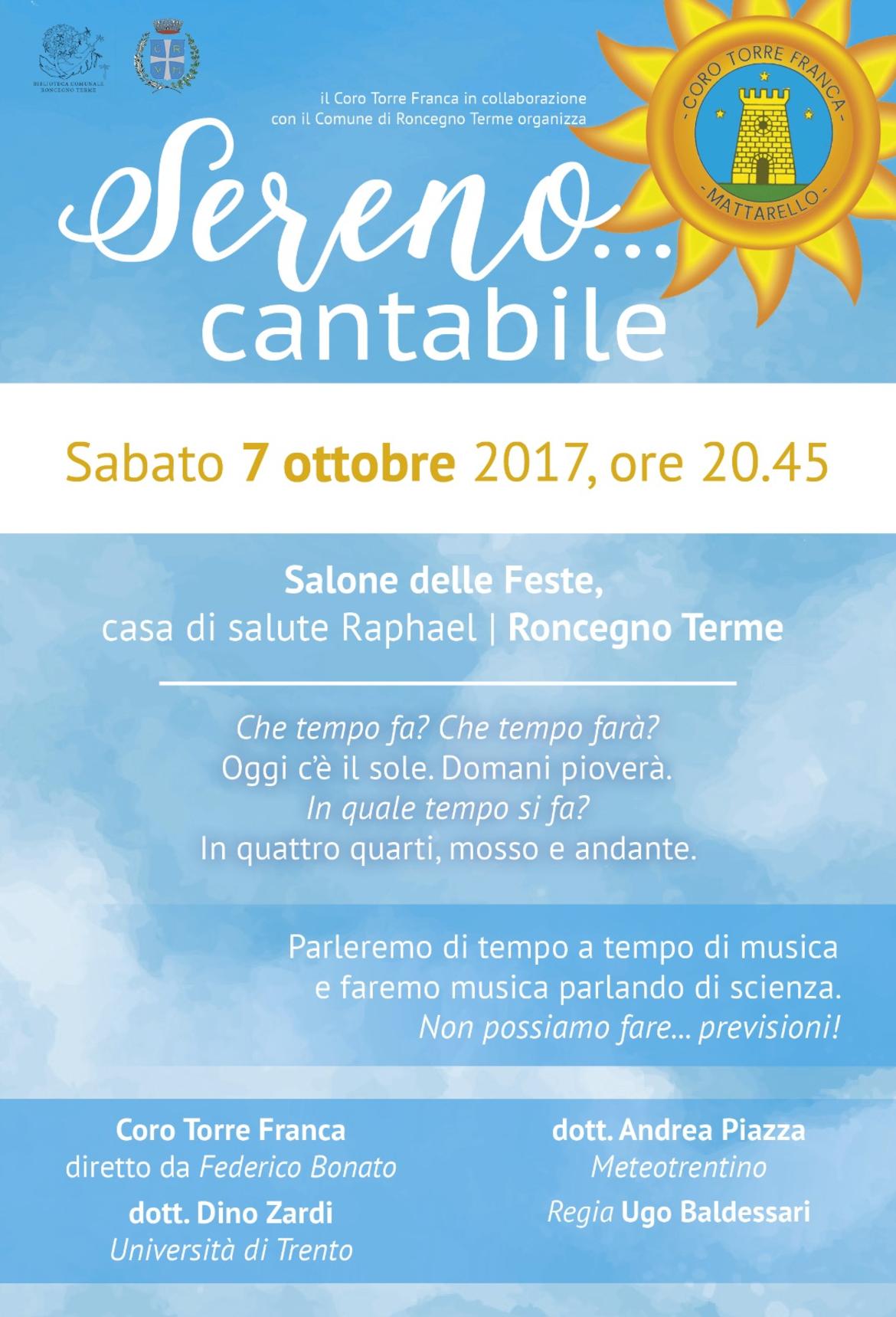 L’evento è organizzato dal Coro Torre Franca in collaborazione con il Comune e la Biblioteca di Roncegno Terme. Si tratta di uno spettacolo nel quale si sposano musica e scienza, con tema comune il tempo. Si alterneranno "pillole" di meteorologia proposte da esperti meteorologi e canti tratti dalla tradizione popolare eseguiti dal Coro.