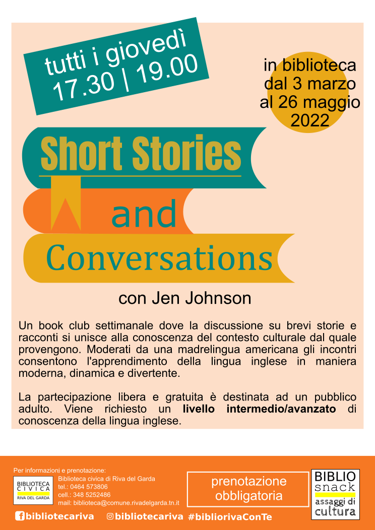 Un book club settimanale dove la discussione su brevi storie e racconti si unisce alla conoscenza del contesto culturale dalla quale essi provengono. Moderati da una madrelingua americana gli incontri consentono l'apprendimento della lingua inglese in maniera moderna, dinamica e divertente.