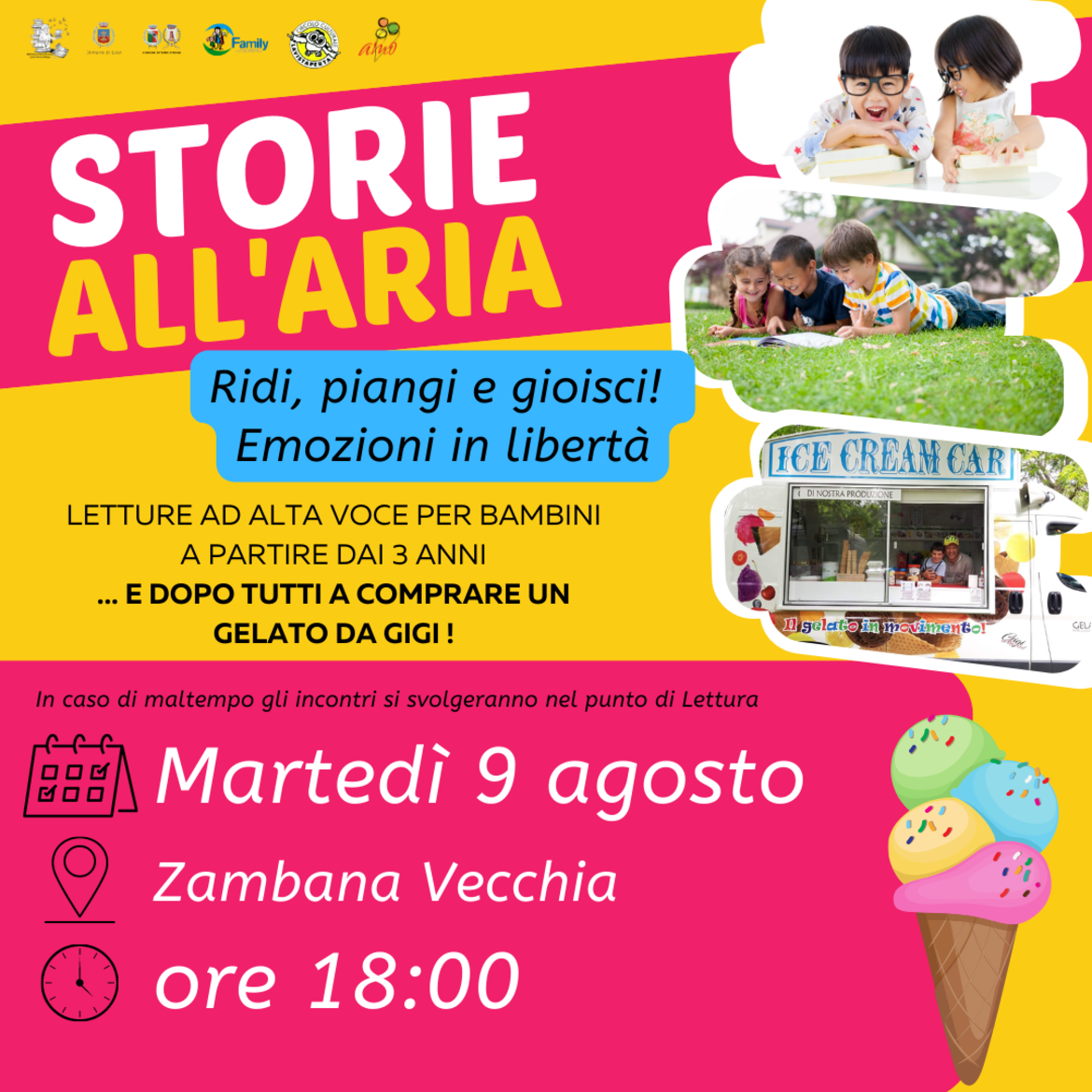 Martedì 9 agosto alle ore 18.00 ci saranno per voi tante emozioni in quel di Zambana Vecchia con le storie all'aria... per poi esultare davanti al camioncino dei gelati di Gelatiamo Mezzolombardo!
