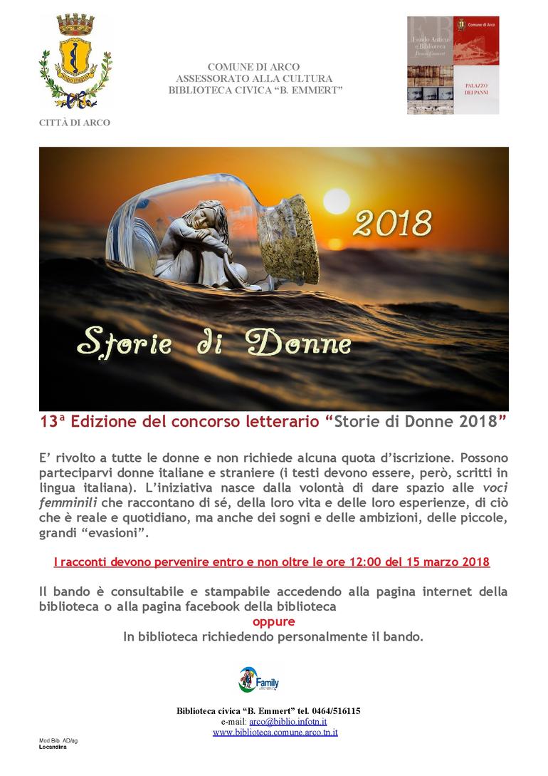 Nella sala Auditorium della biblioteca si terrà la tradizionale cerimonia di premiazione del 13° concorso letterario Storie di donne, promossa dalla Biblioteca civica «Bruno Emmert» di Arco con la collaborazione dell'Ospedale San Pancrazio.